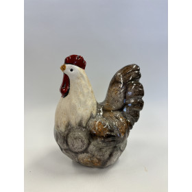 Kura ceramiczna w kolorach biało brązowych z czerwonym grzebieniem